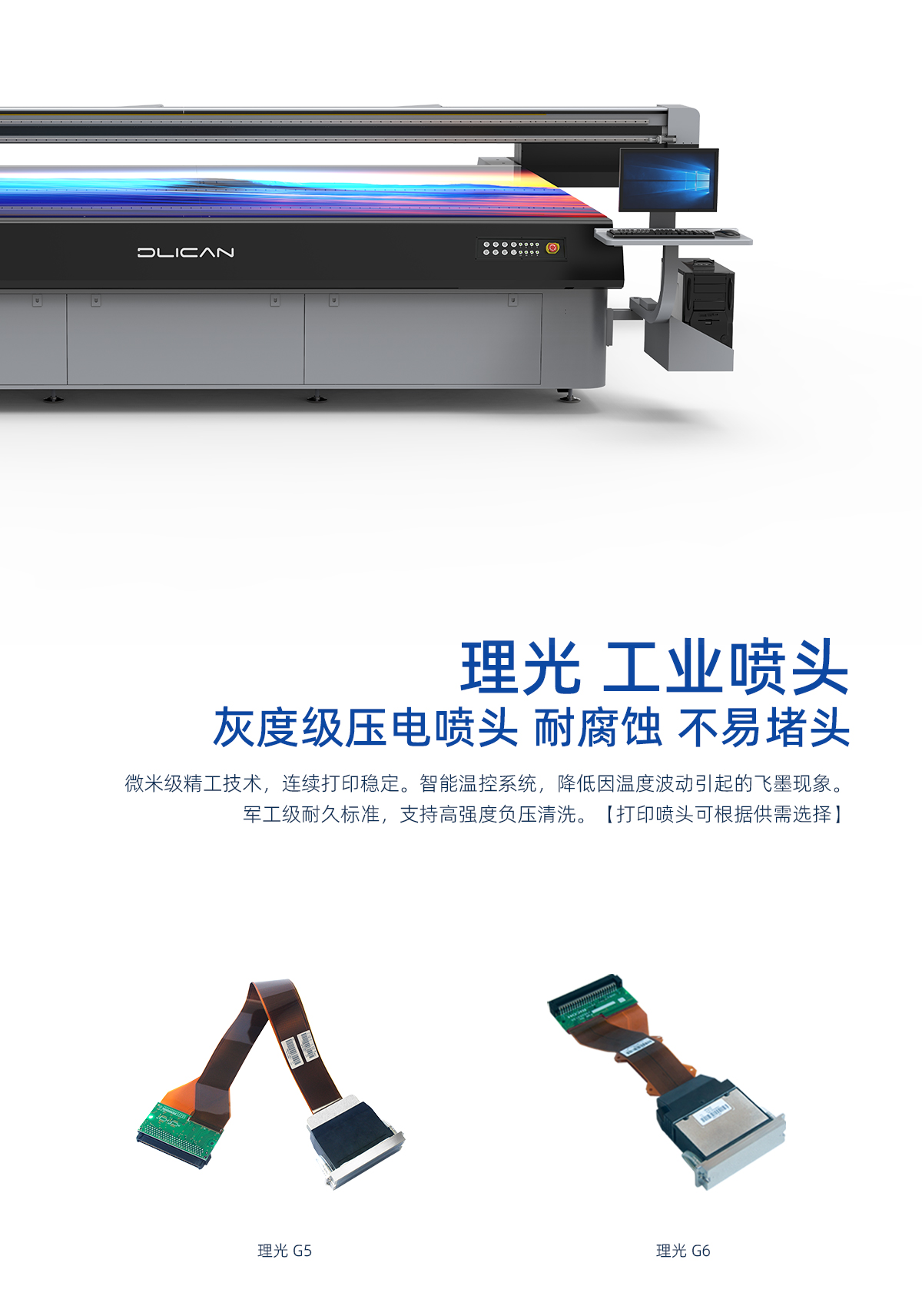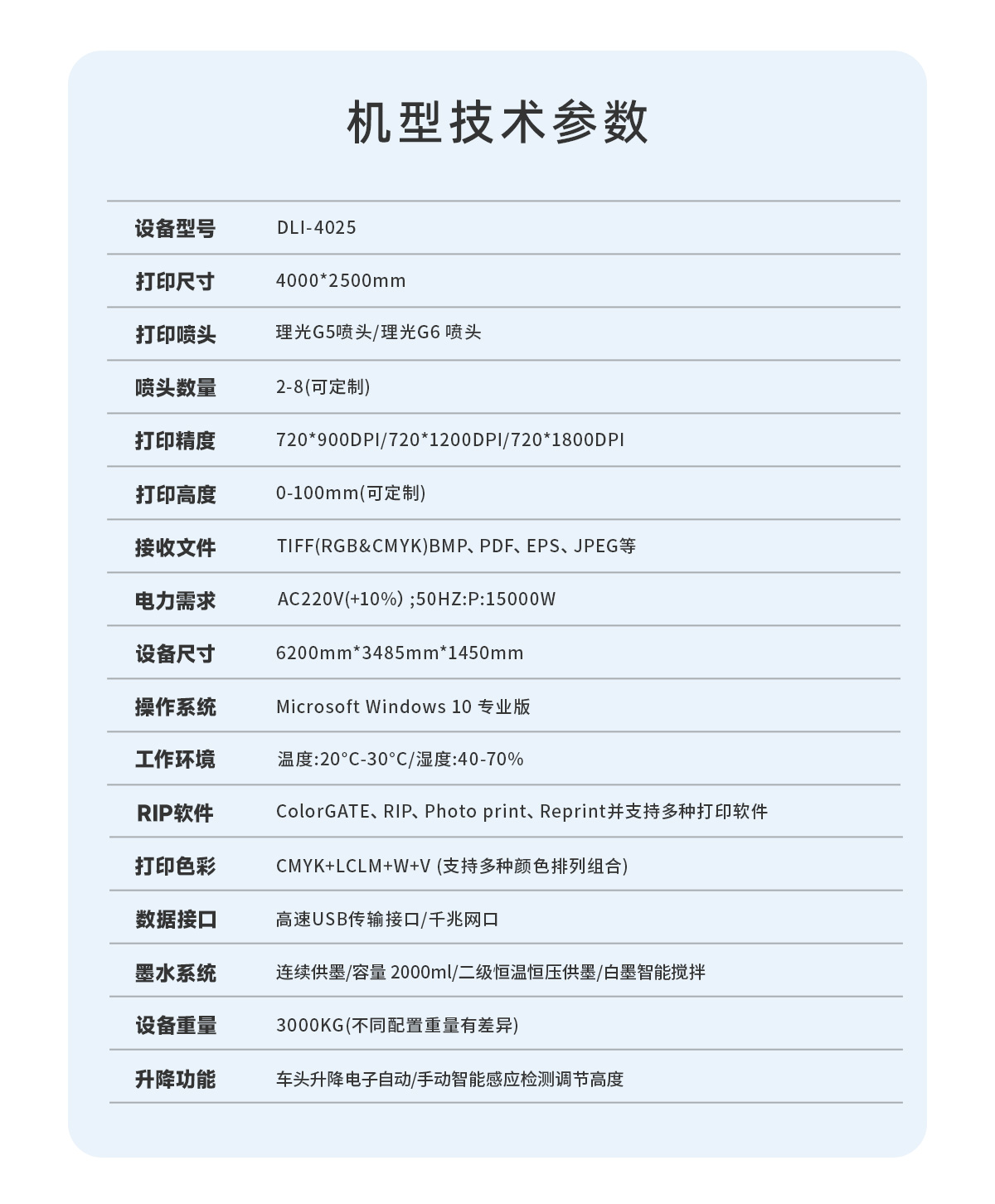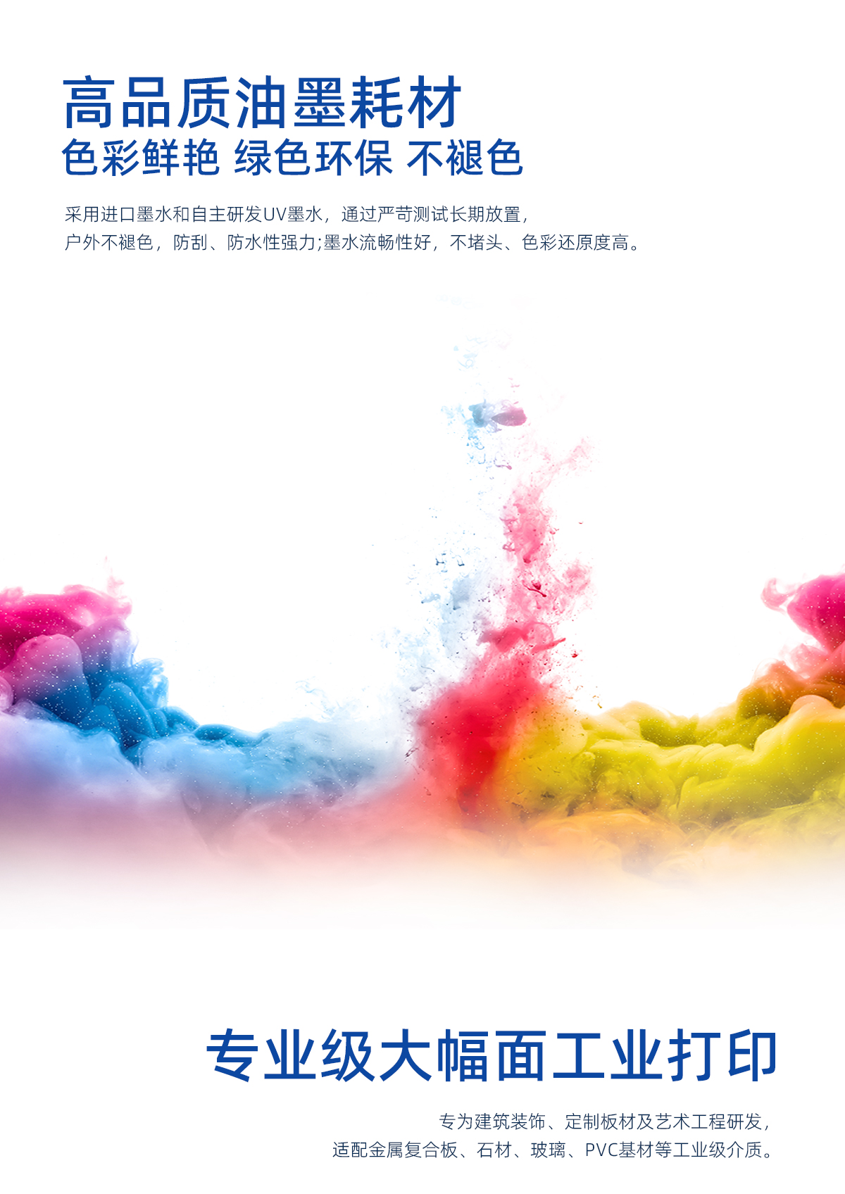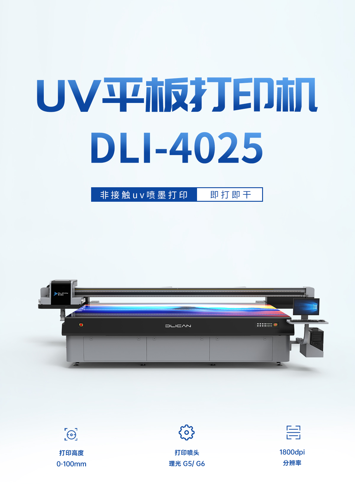 产品描述:打印尺寸1m*1m,小巧机身灵活应对多种打印需求,稳定高效,白彩光油同步打印,高分辨率彩印效果,打印图像效果细腻清晰。